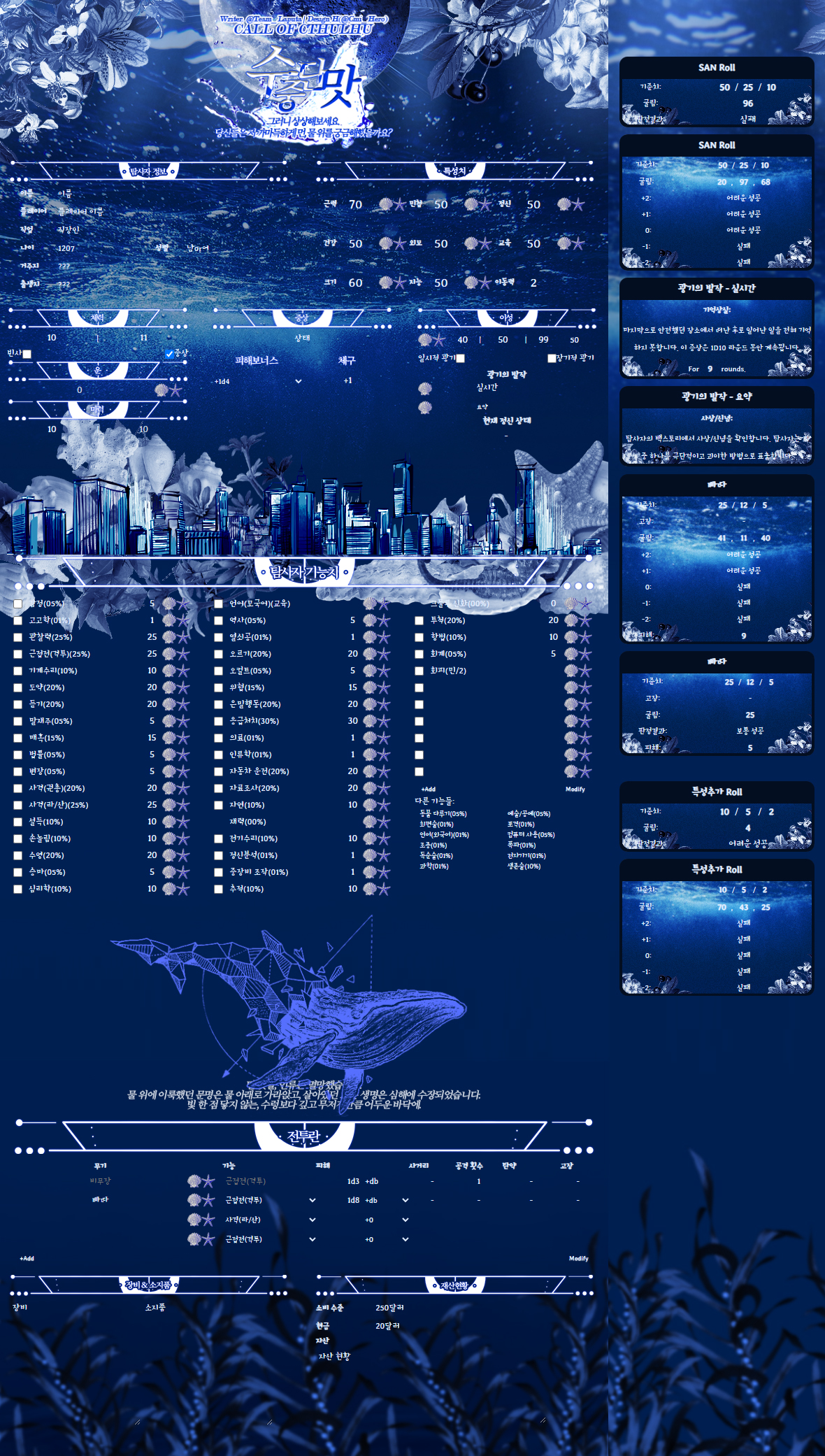 COC 공식 시트 코드를 사용했고, 이 외의 CSS 수정, 디자인을 H(@HE_TRPG)을 했으며, 그럴일은 없으시겠지만... 기본적인 수정및 가공만 하지않으시면 사용은 자유롭습니다. 해당시트는 Roll20 Pro를 사용하셔야만 시트 사용이 가능합니다. 기본적인 사항만 지켜주시면 사용이 자유롭습니다~